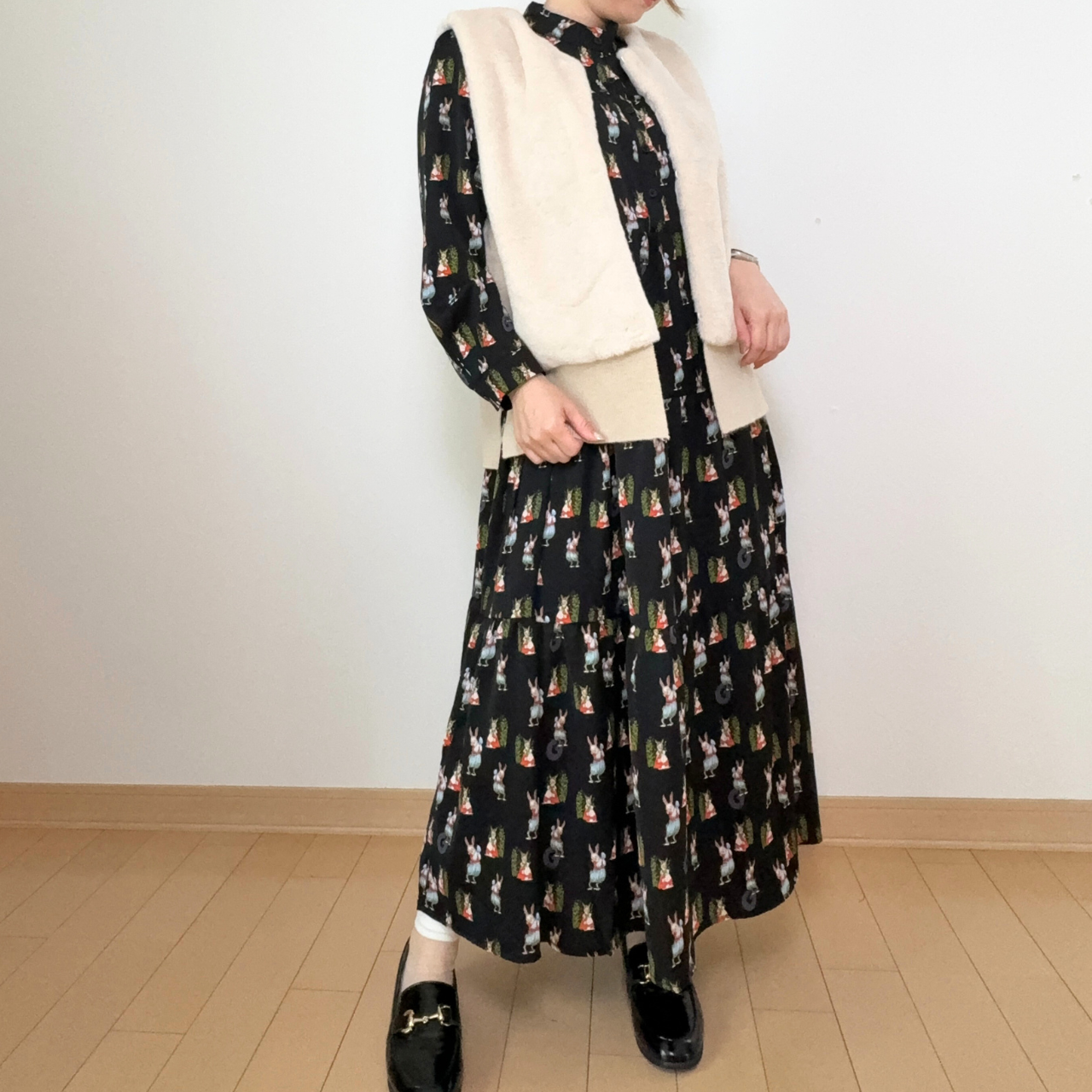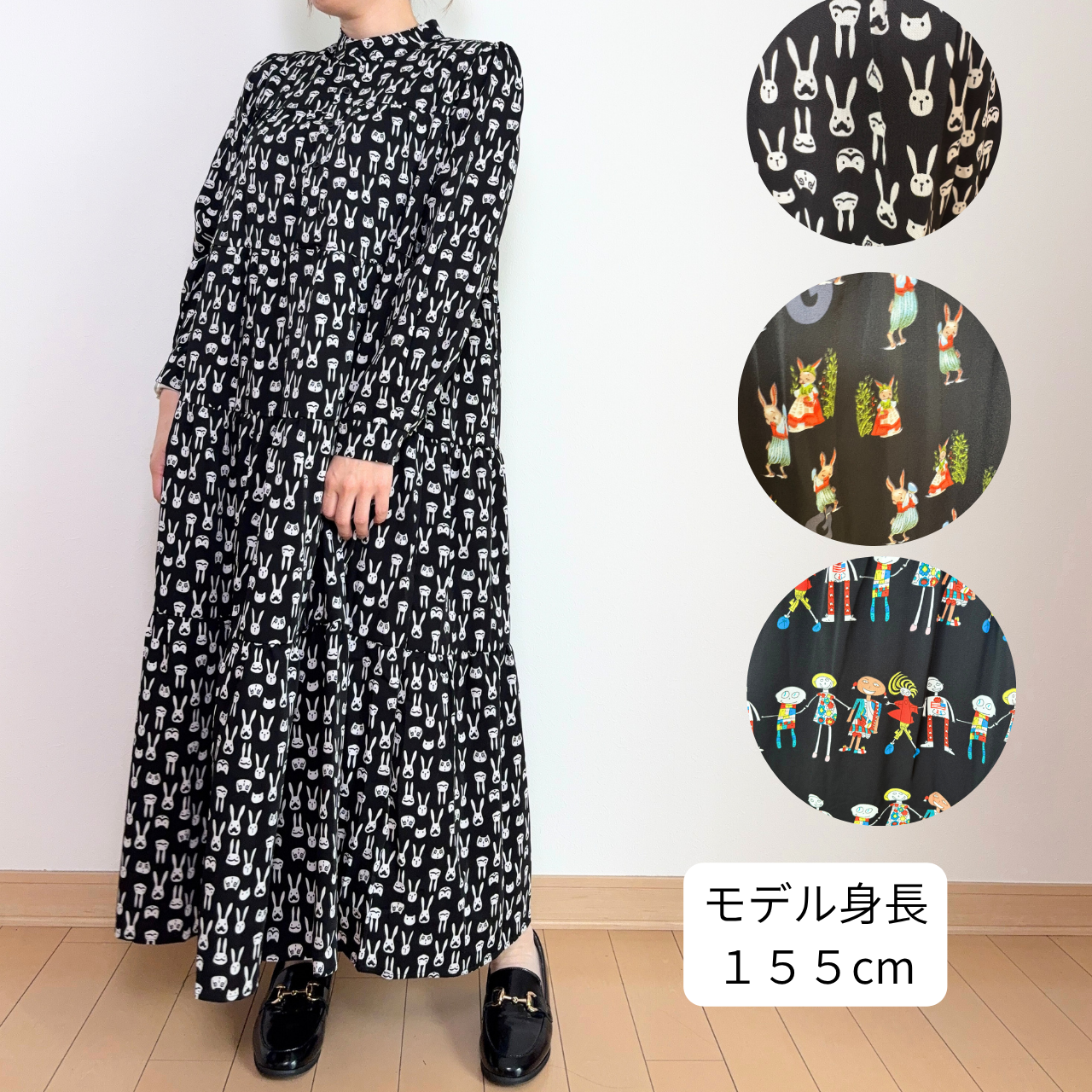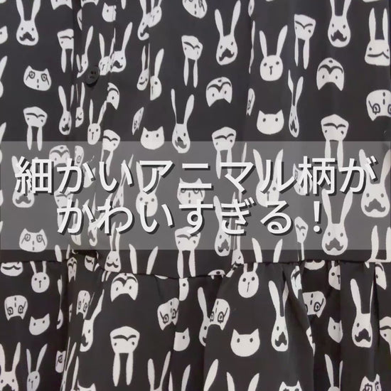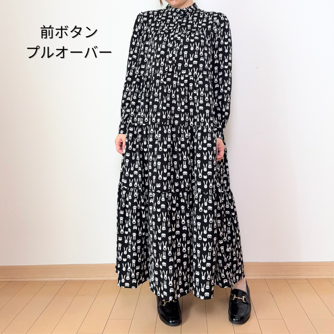 【プルオーバー】前ボタンロングワンピース|3柄 ラビット/モノトーン手書き風アニマル/フィギア