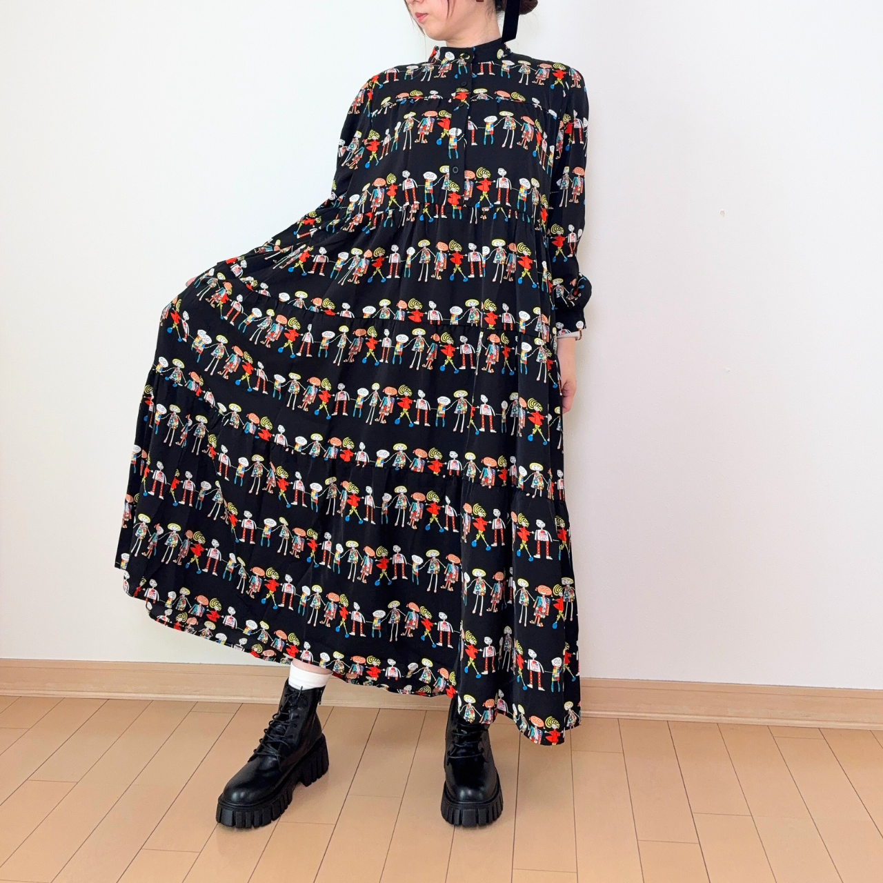 大人可愛い総柄プリントが目を惹く、ロング丈の前ボタンプルオーバーワンピース。