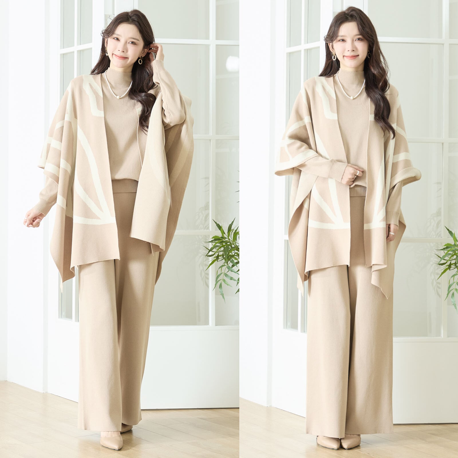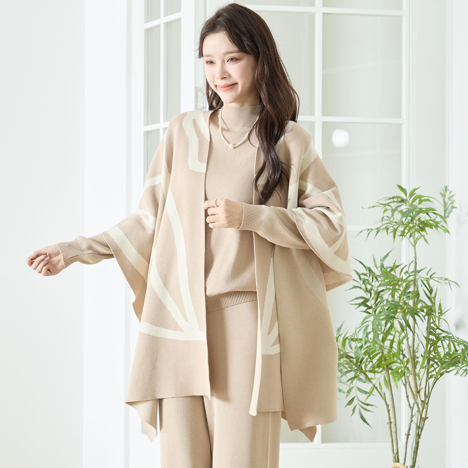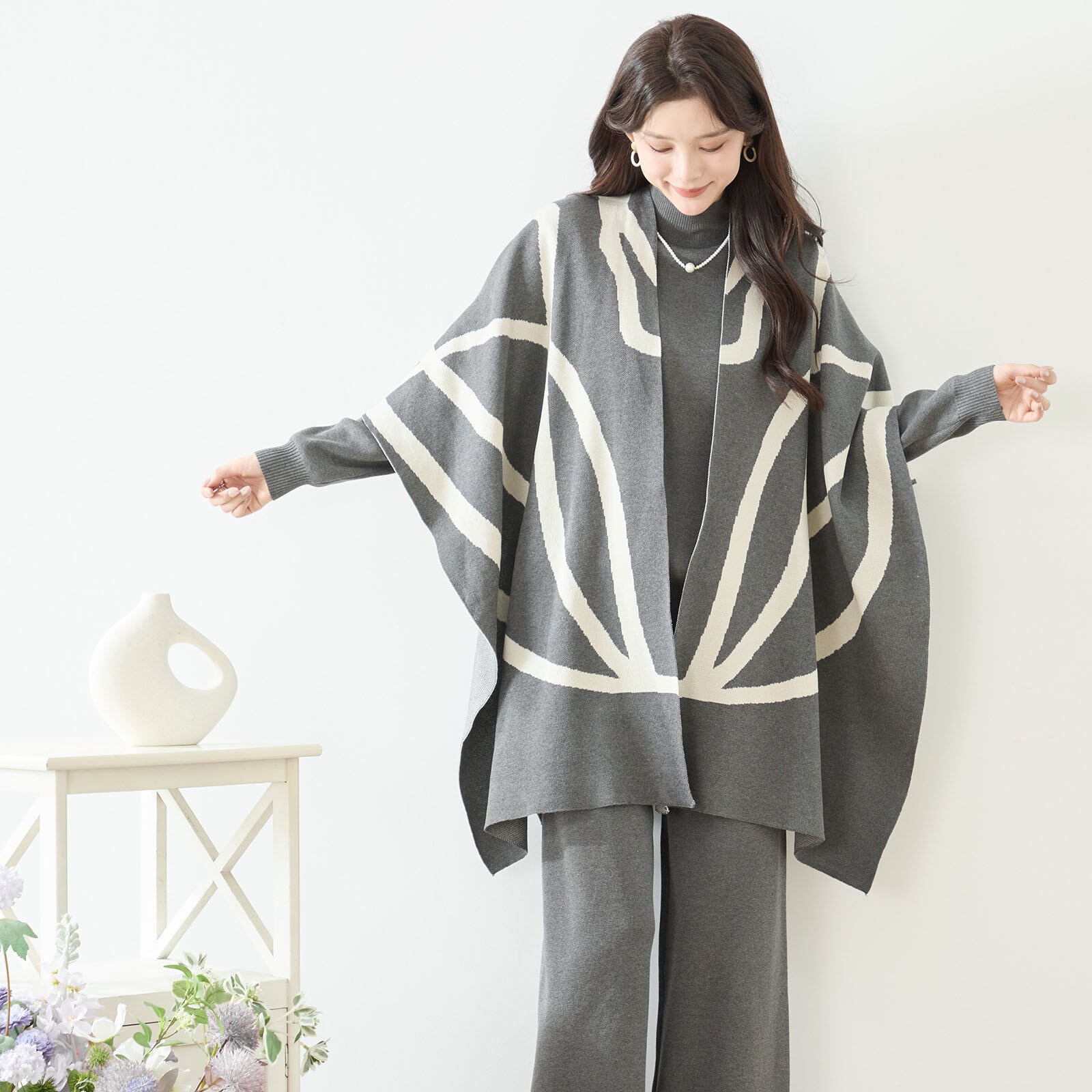 ライン柄ジャガードニットの3点セット。