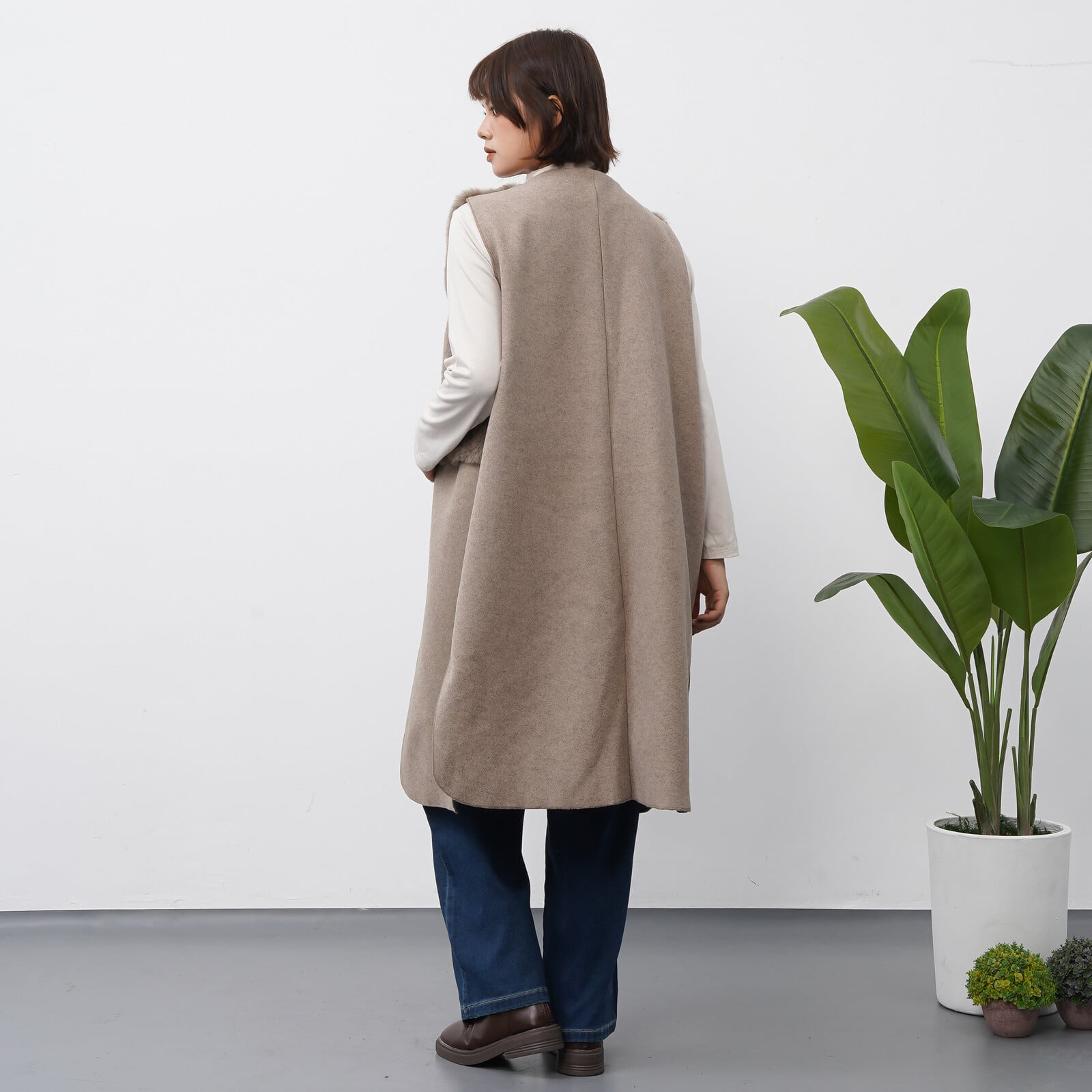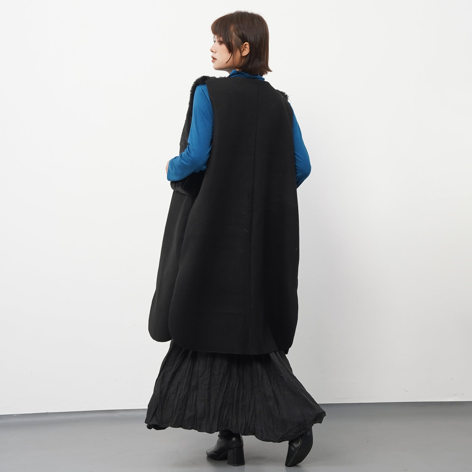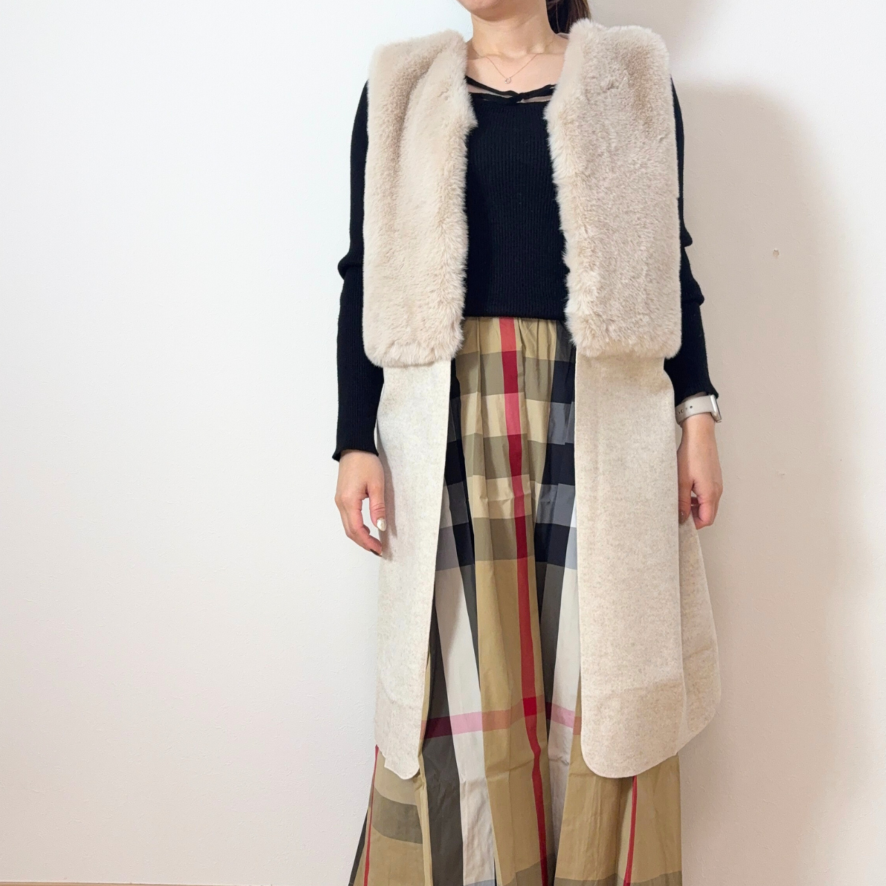 「体型カバー」と「着膨れしないシルエット」を両立させた大人のためのロング丈ファーベストです。