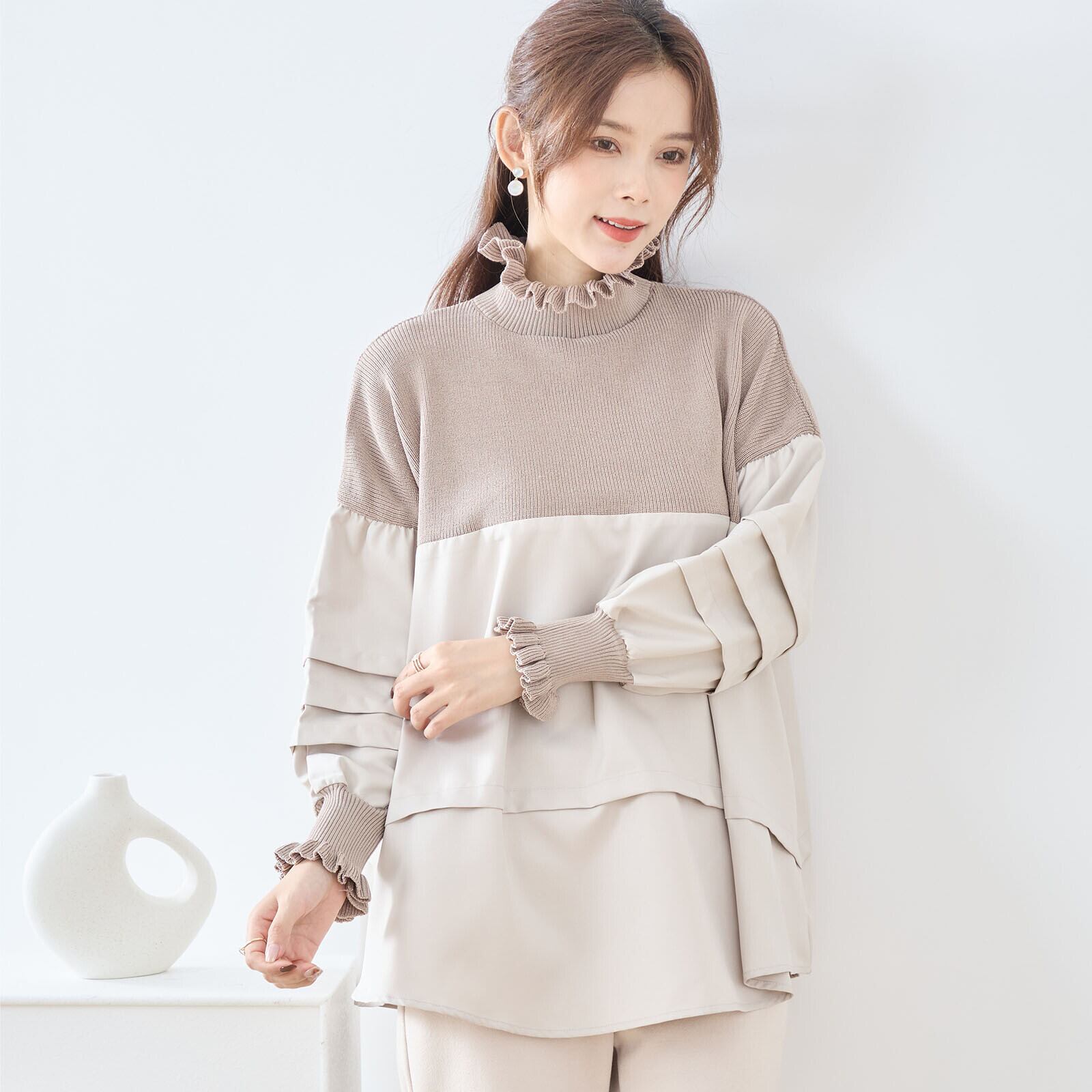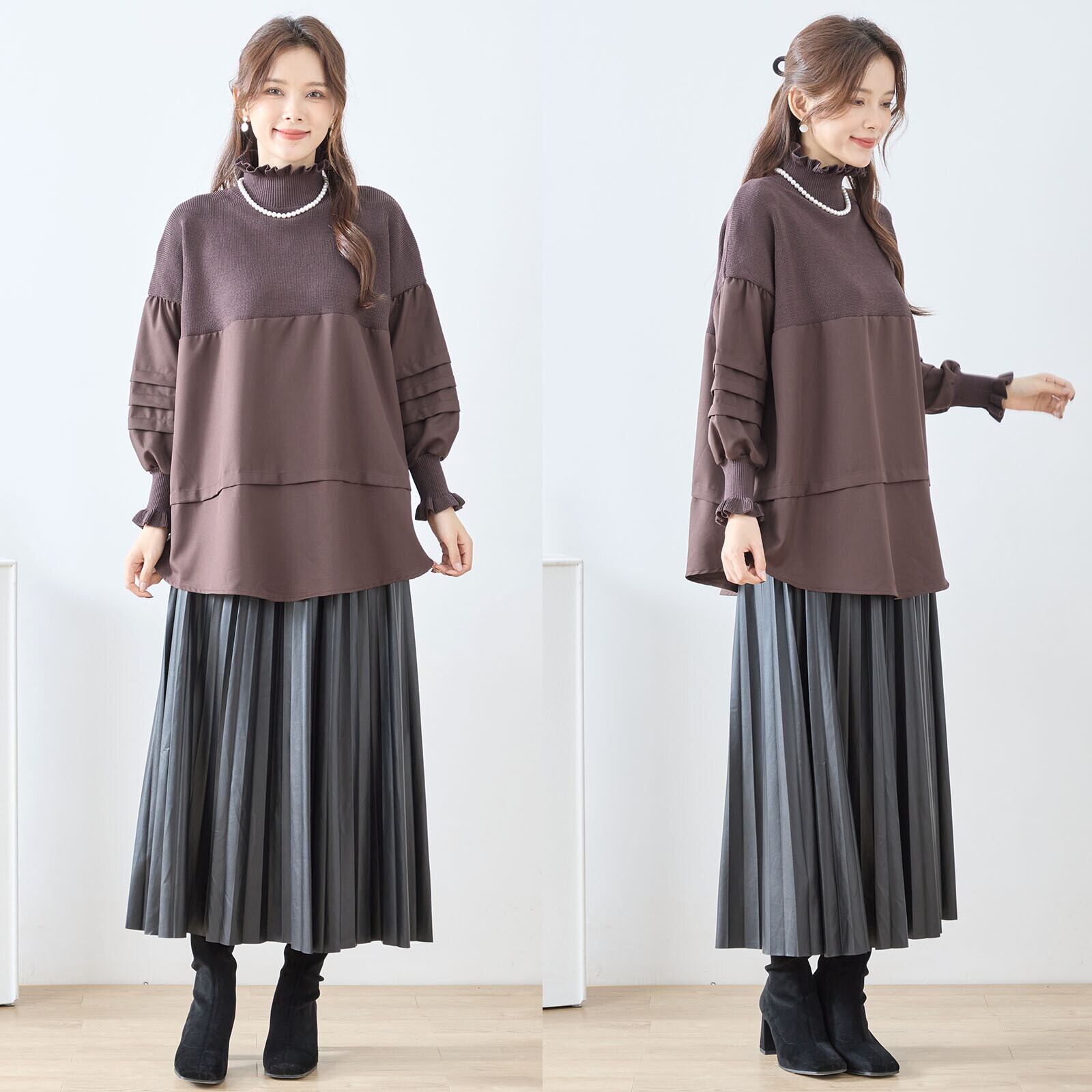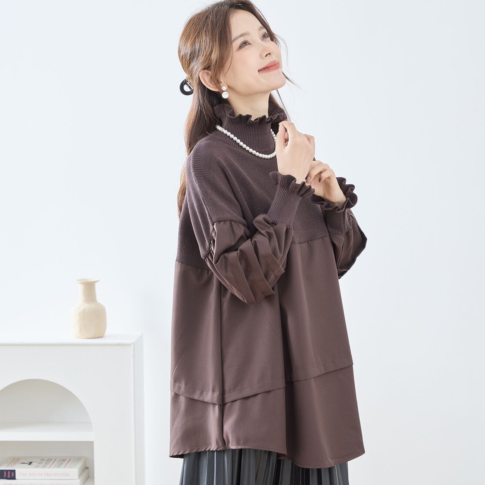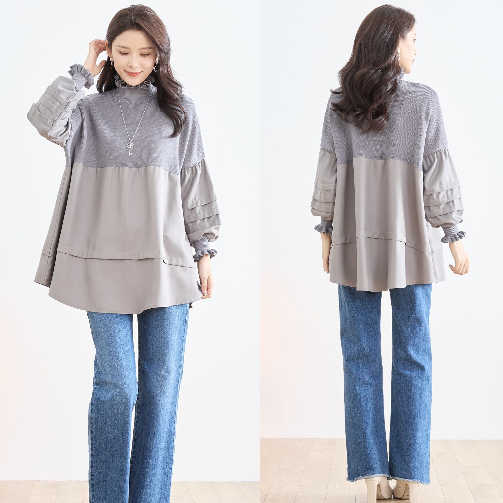 異素材切り替えフリルネックチュニック/やわらかトーンの体型カバーニットドッキングブラウス