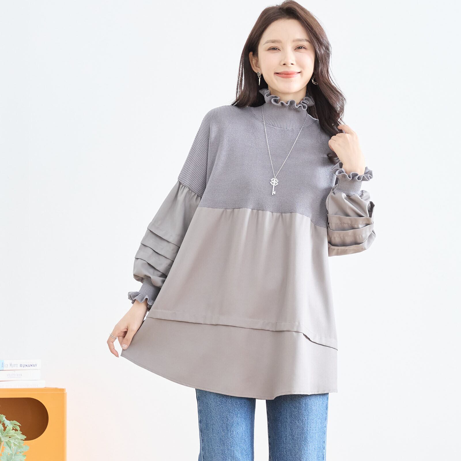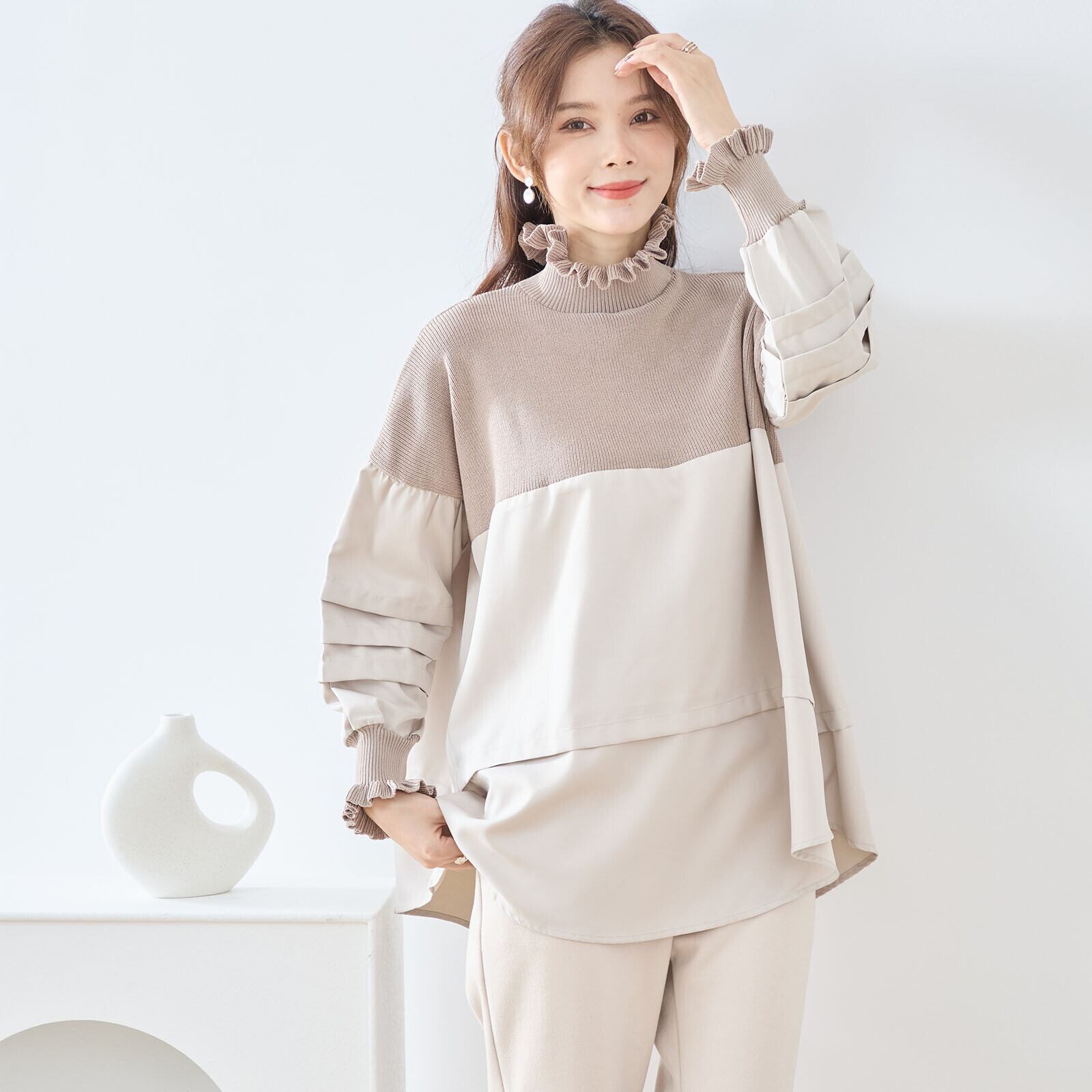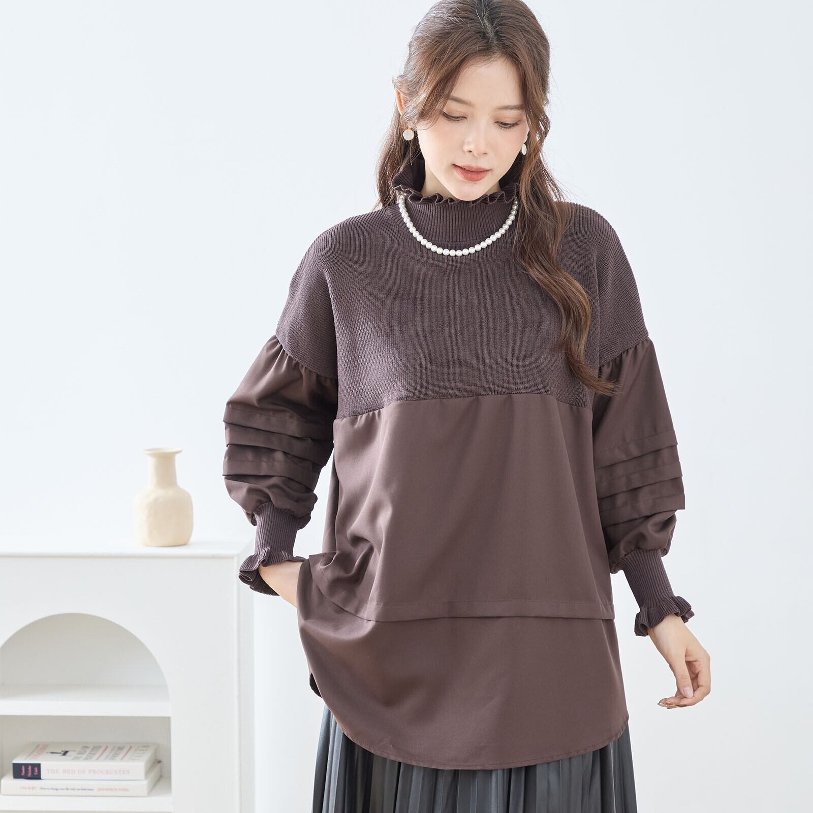 異素材切り替えフリルネックチュニック/やわらかトーンの体型カバーニットドッキングブラウス