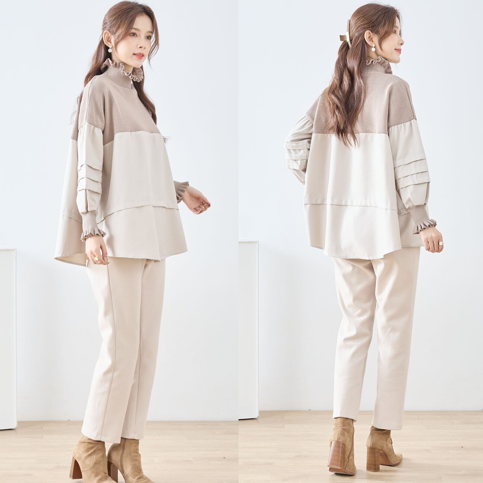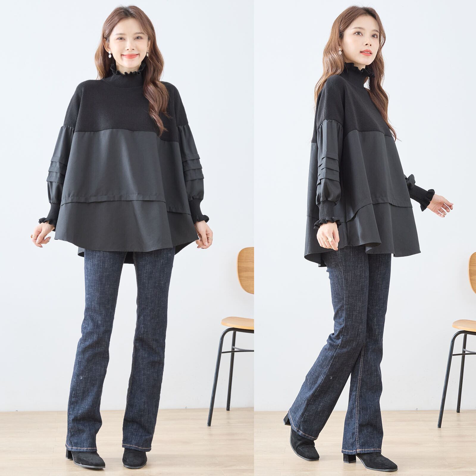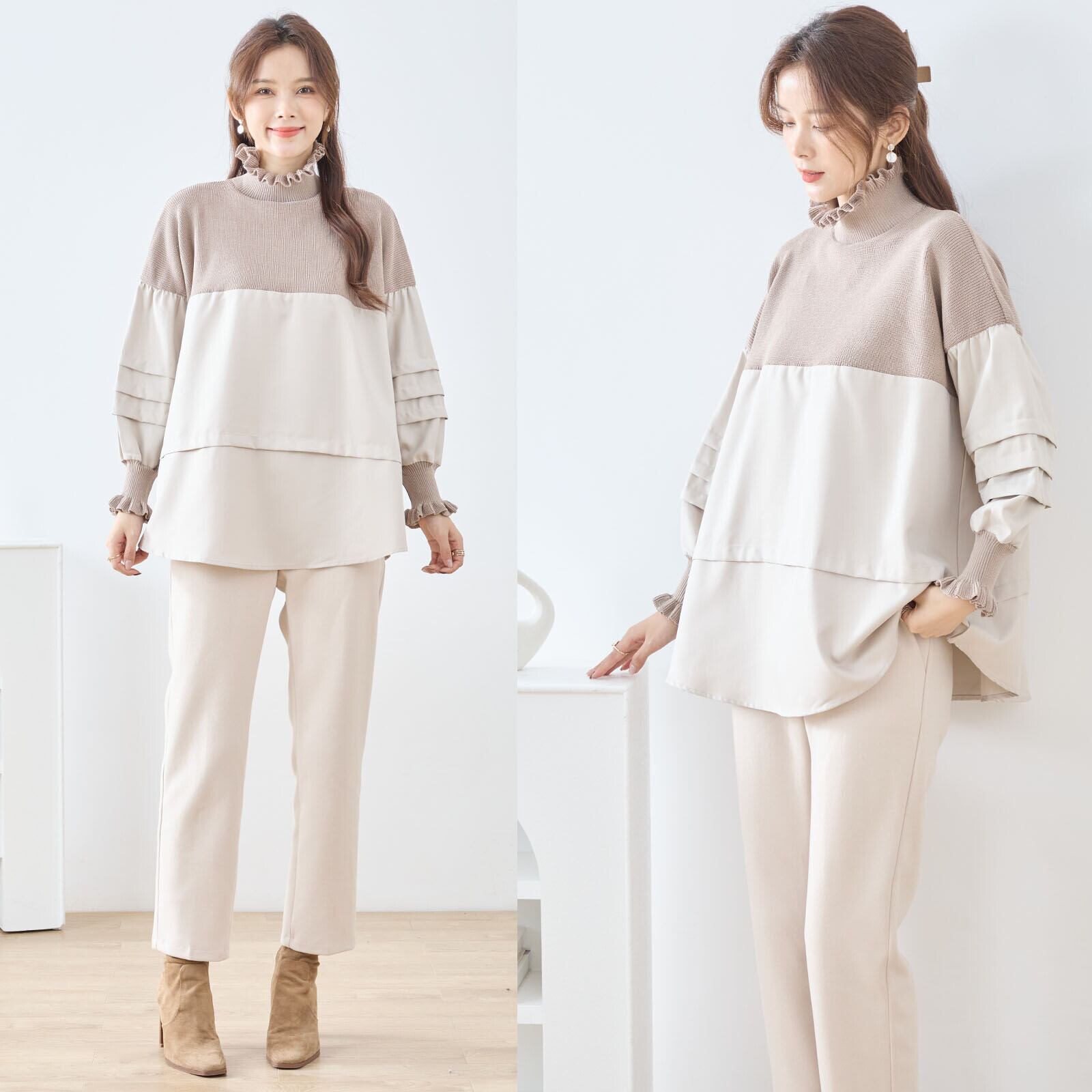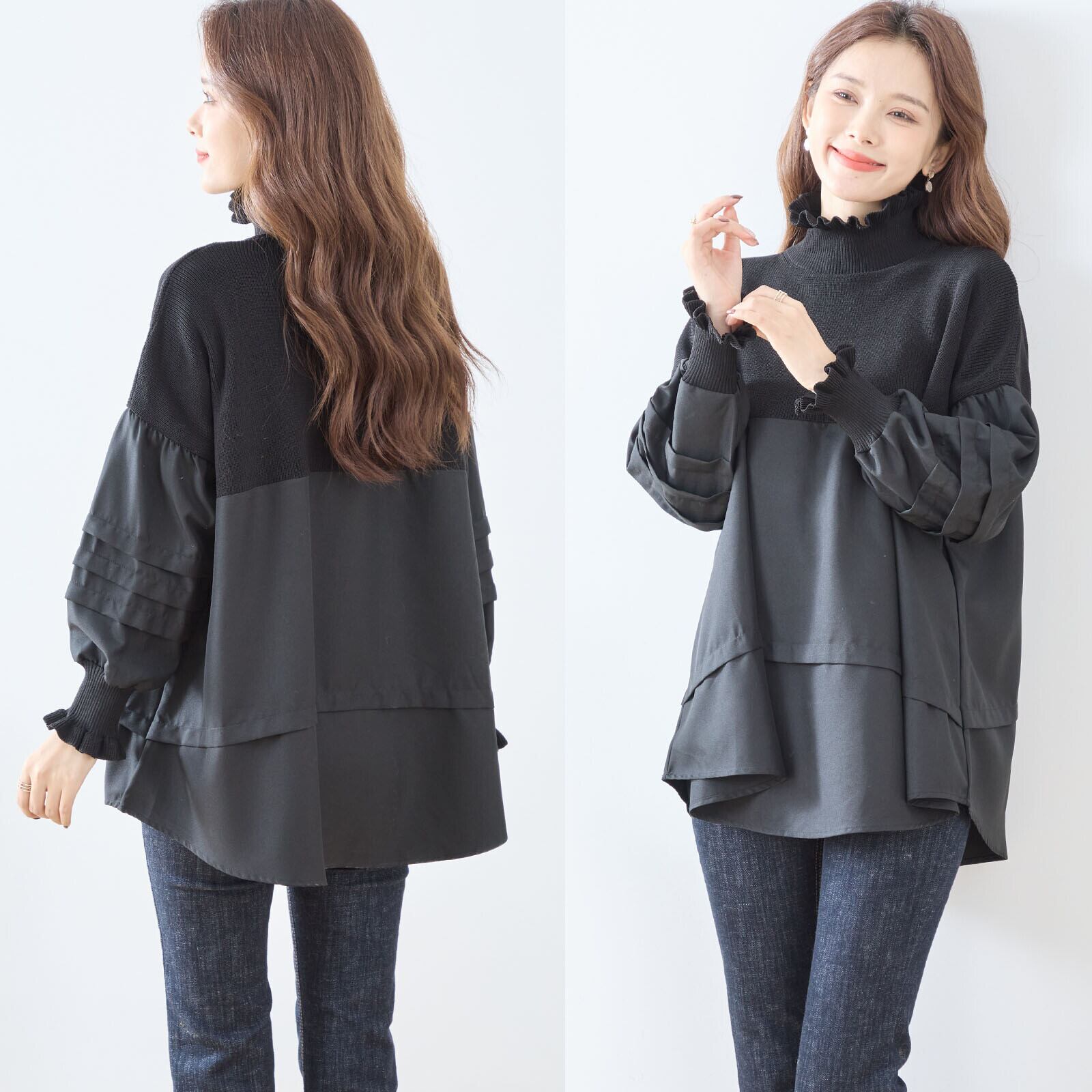 異素材切り替えフリルネックチュニック/やわらかトーンの体型カバーニットドッキングブラウス