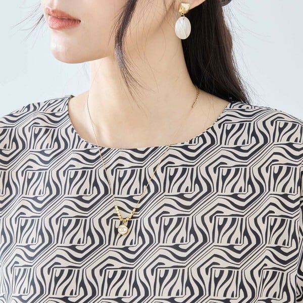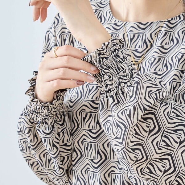長袖デザインは季節の変わり目から秋冬まで活躍し、袖口のシャーリングが女性らしい柔らかさをプラスします。