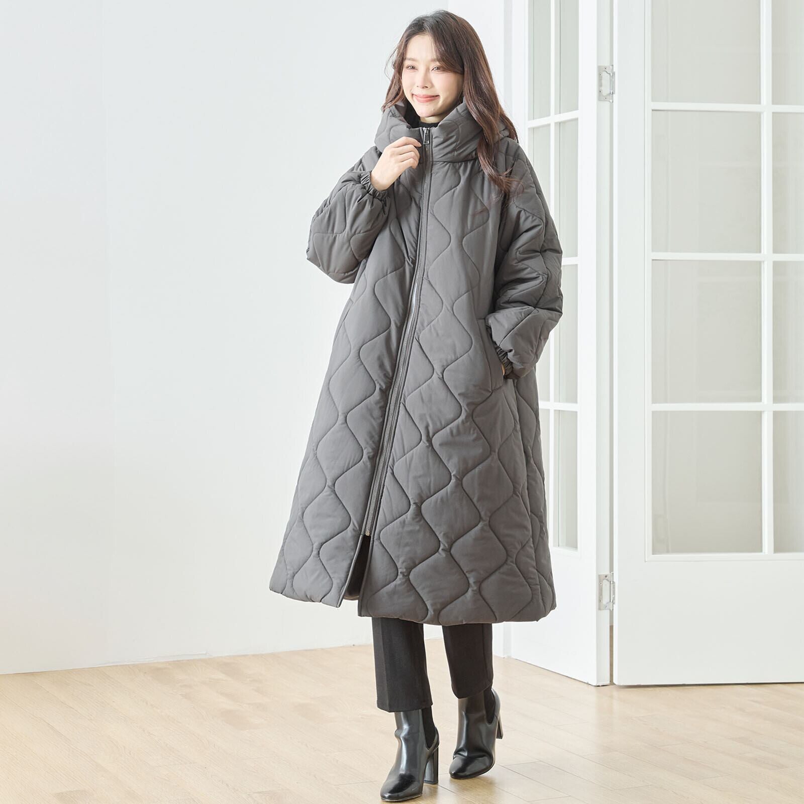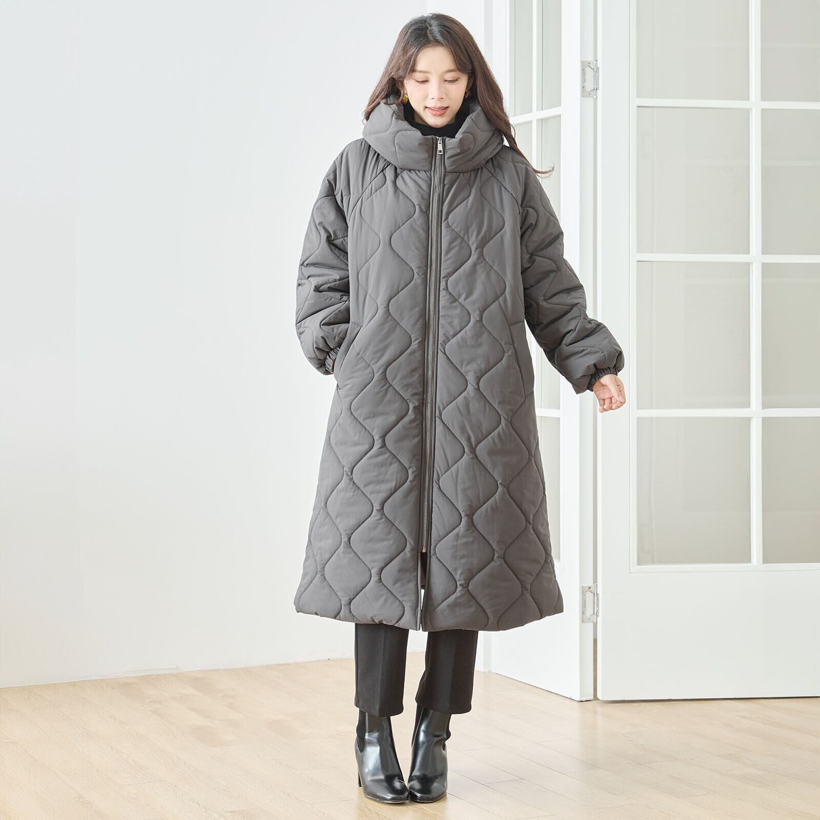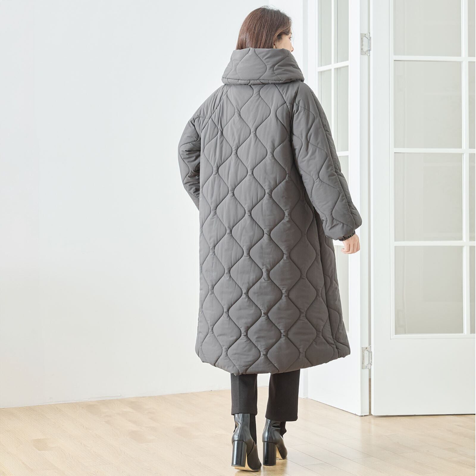 キルティングは柔らかな波キルトを採用し、体のラインに沿うように縦を意識したデザインで、すっきり見えを実現。膝下まで届くロング丈ながら軽い着心地で、普段使いはもちろん通勤にも活躍します。