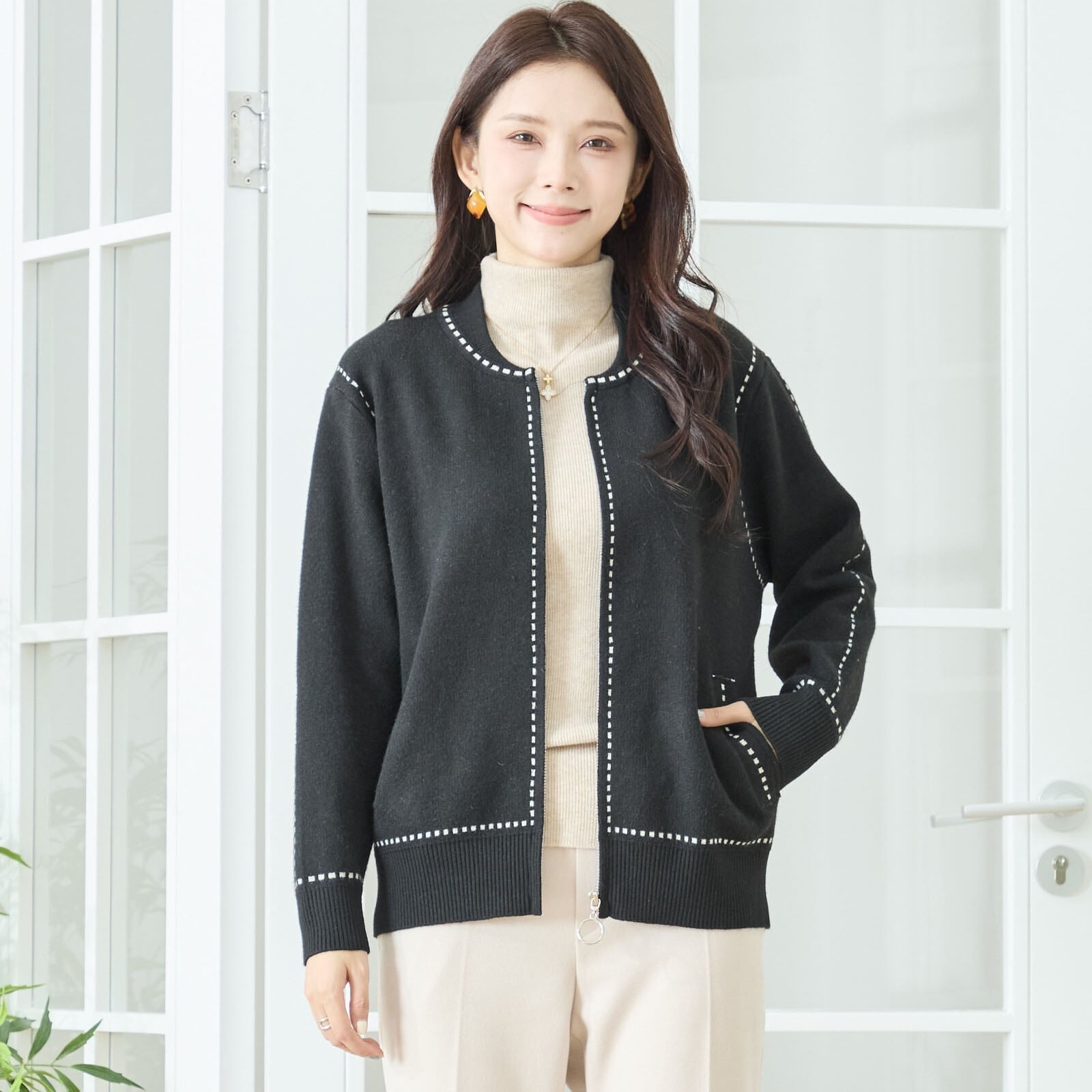 シンプルな中に、さりげない配色ステッチが映えるジップアップニットカーディガン。