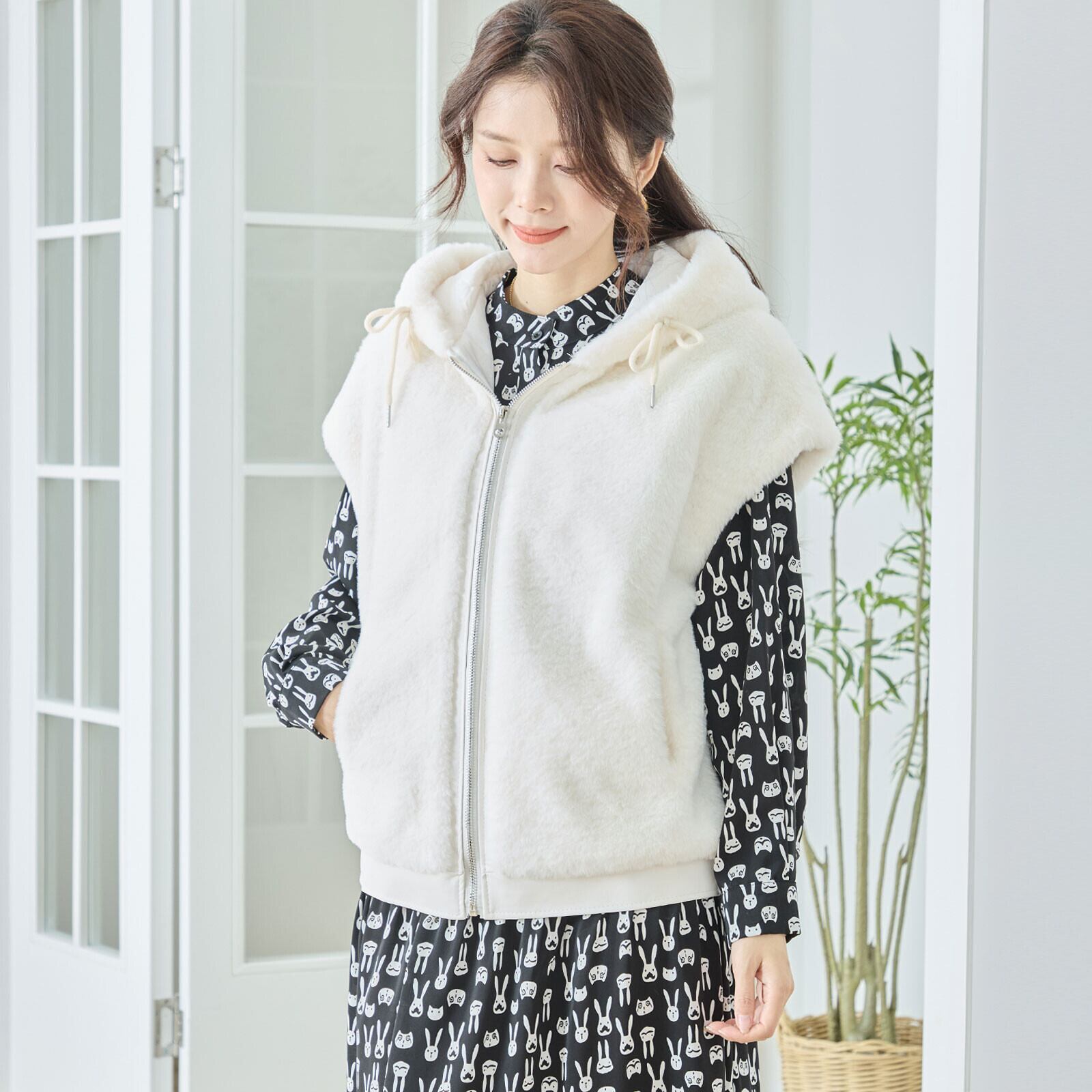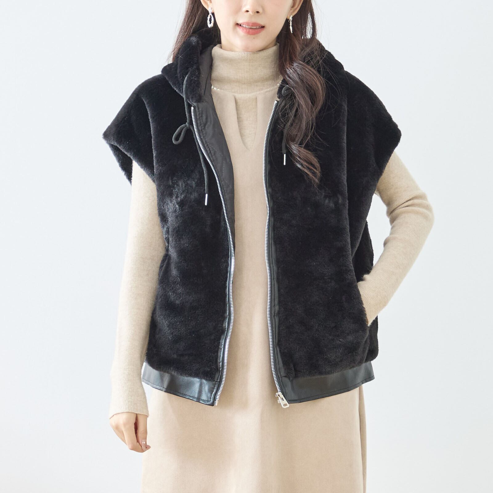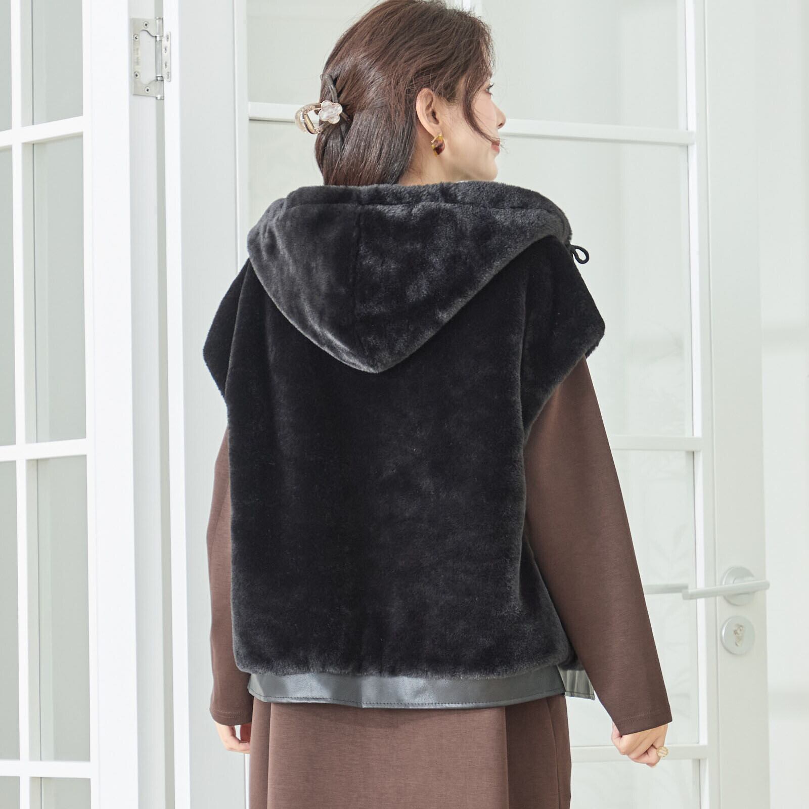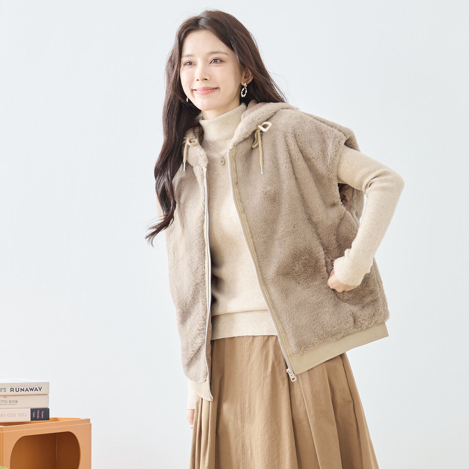 やわらかな肌ざわりと軽やかな着心地が魅力の、フード付きボアベスト。