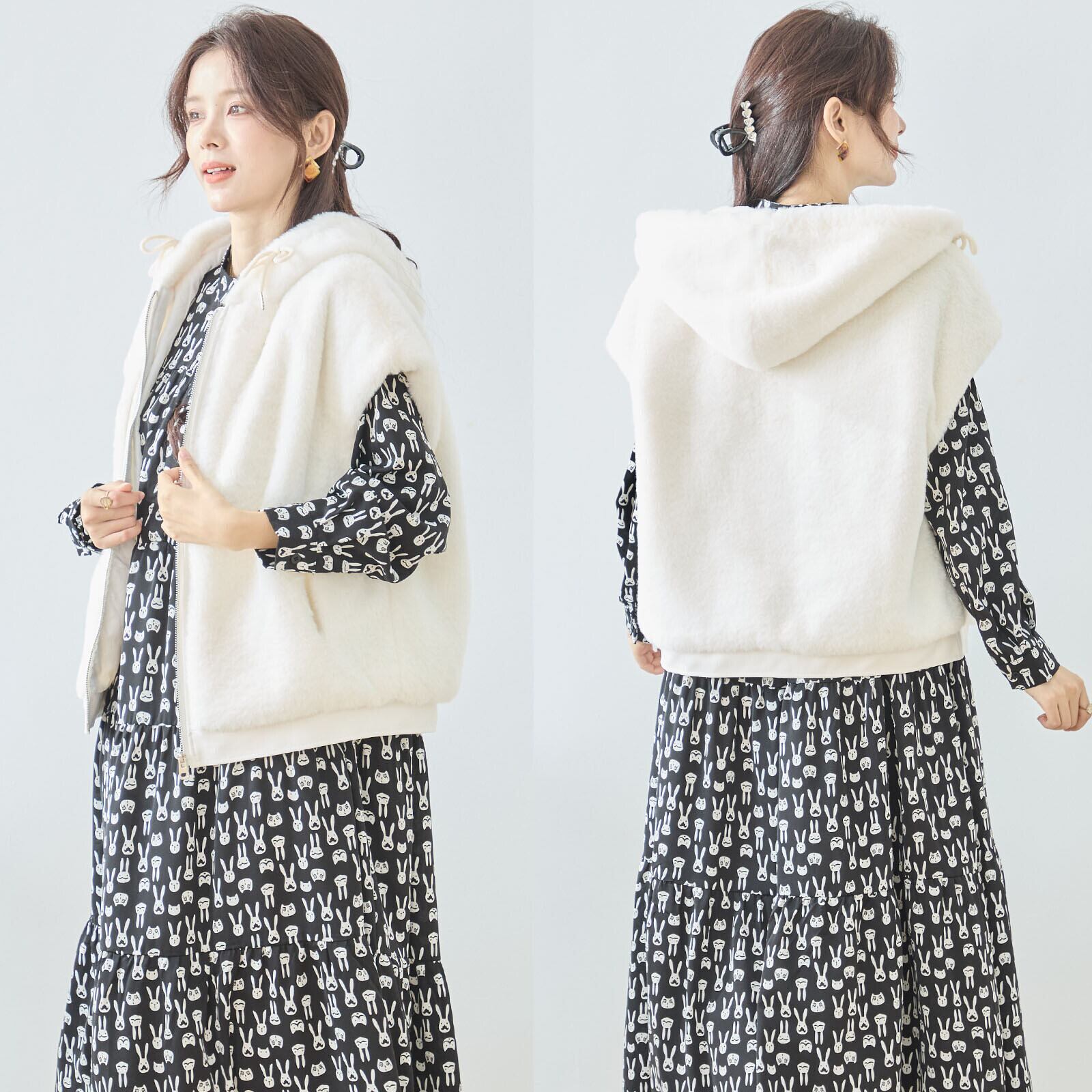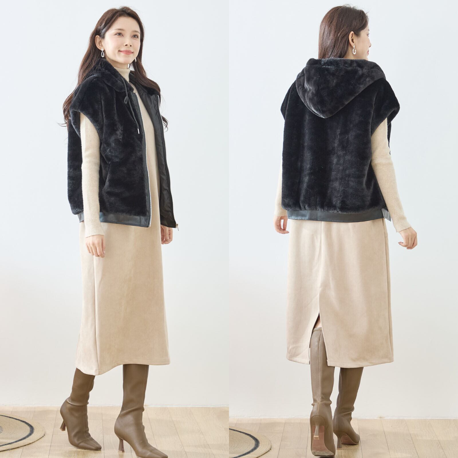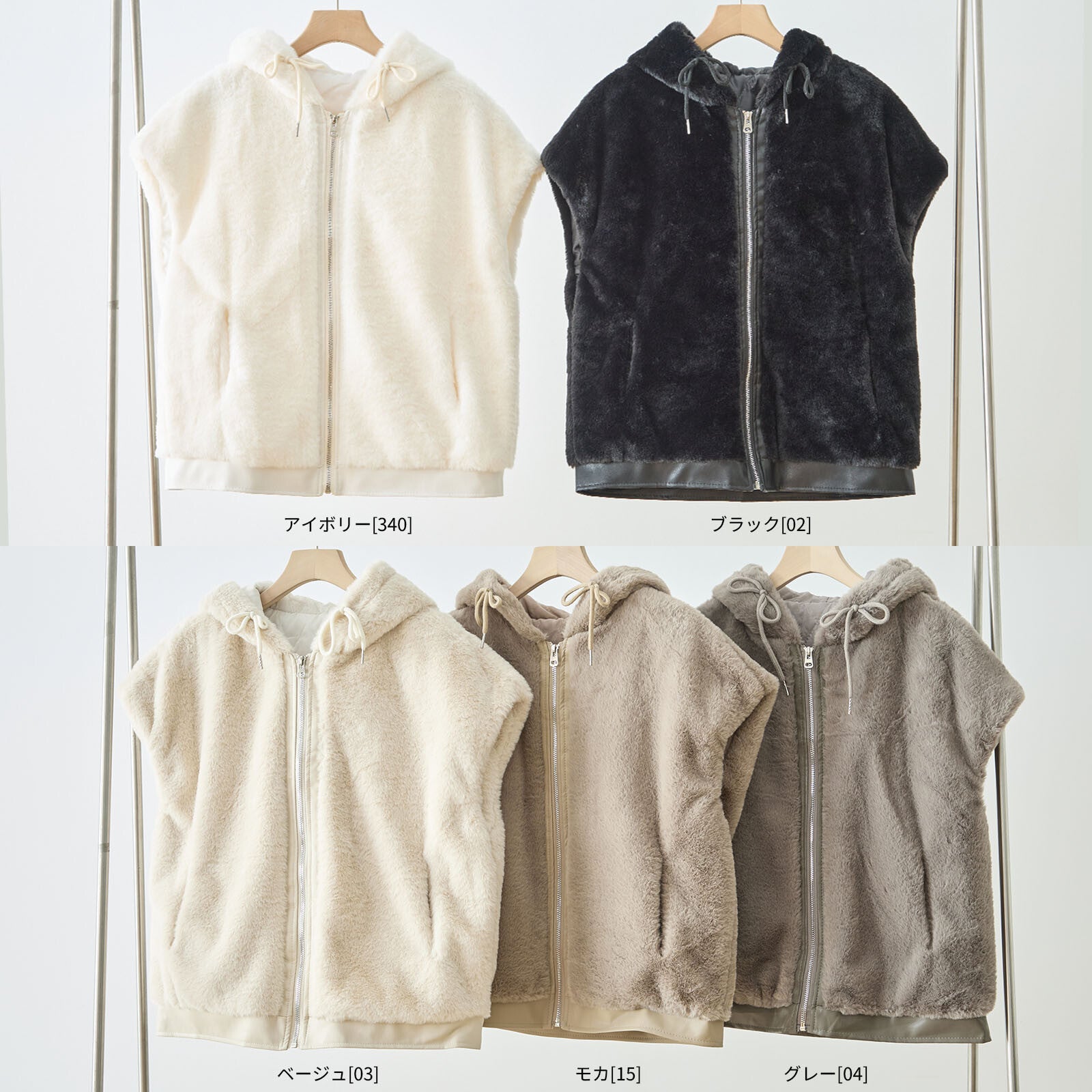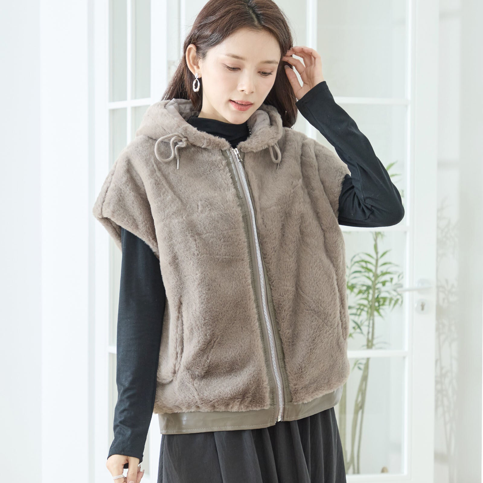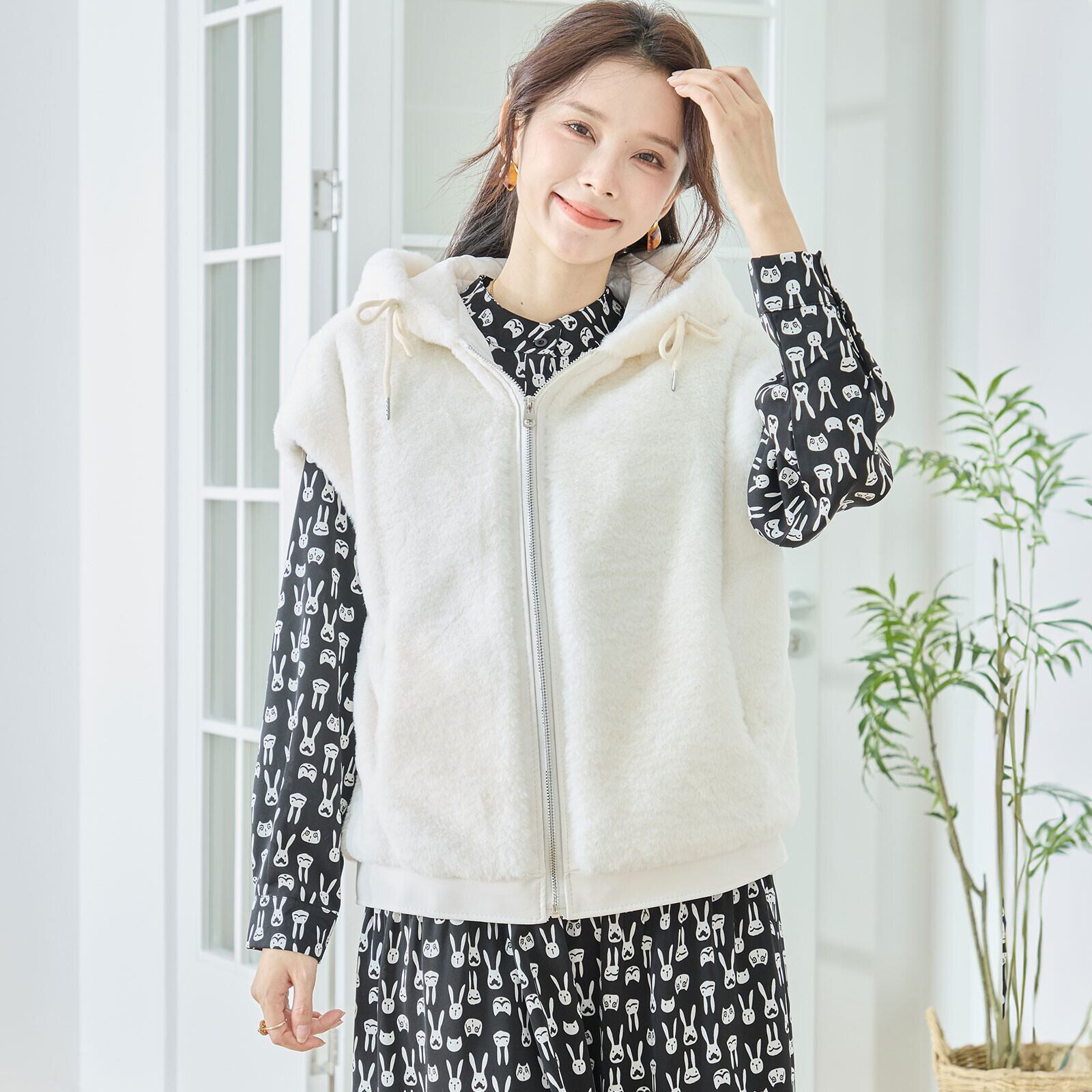 やわらかな肌ざわりと軽やかな着心地が魅力の、フード付きボアベスト。