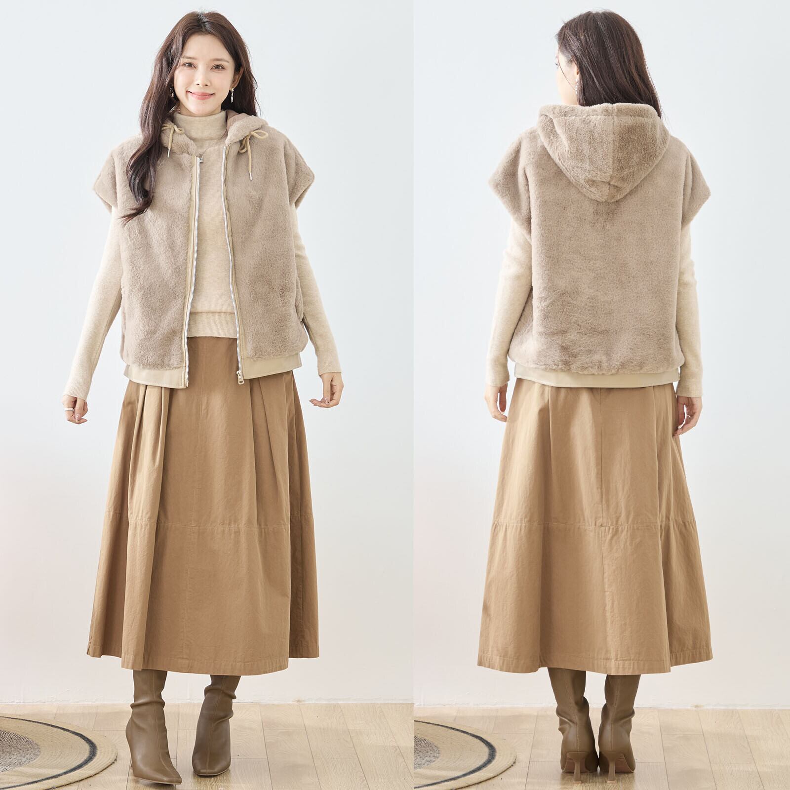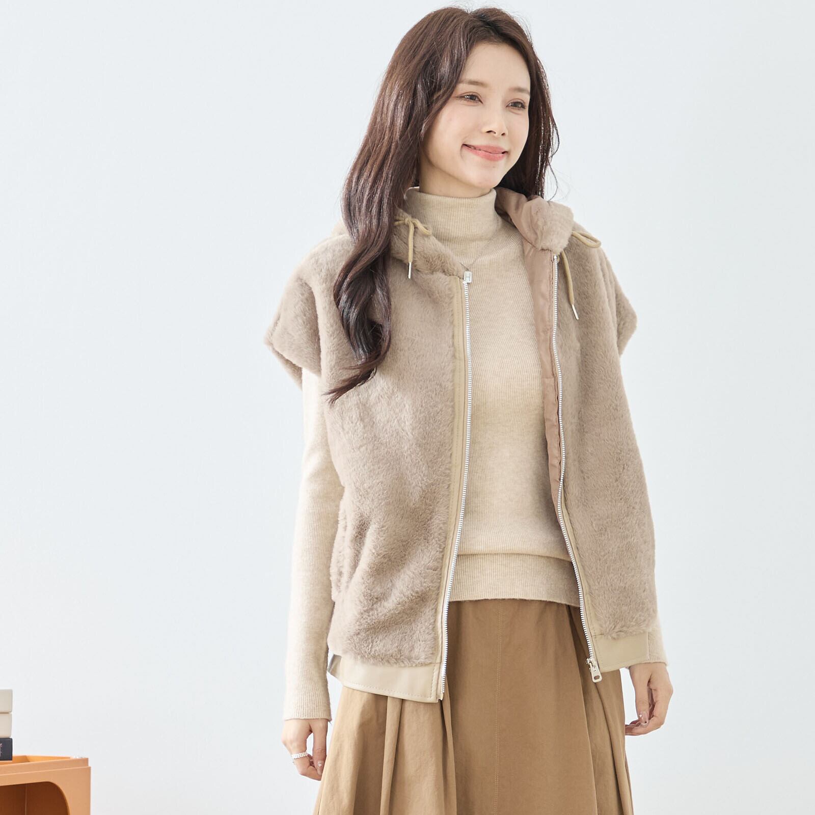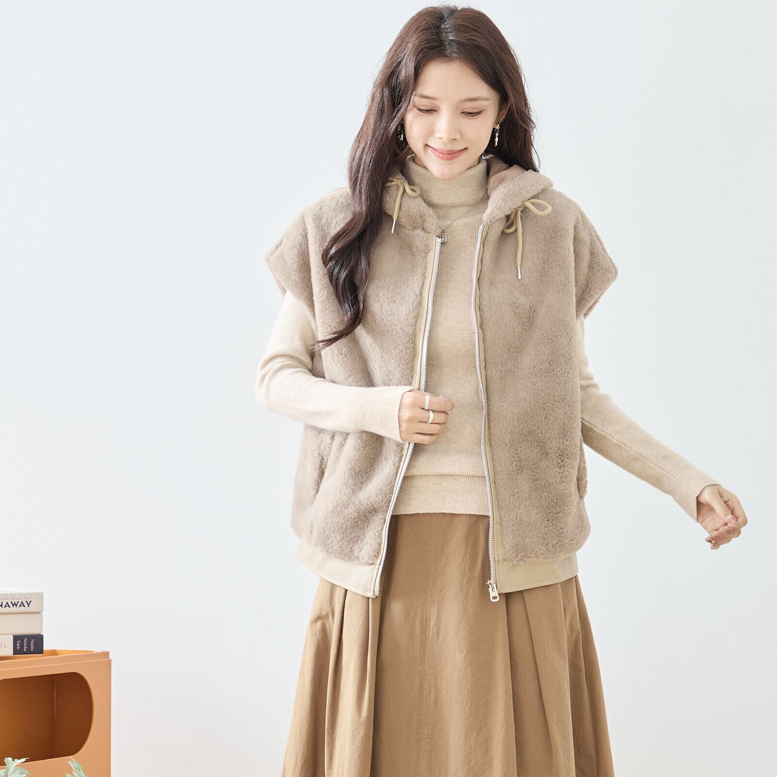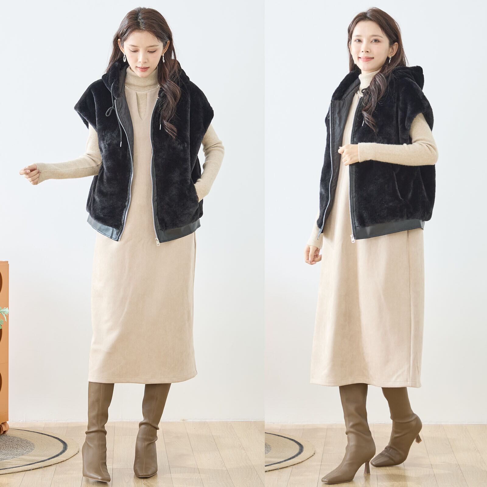 やわらかな肌ざわりと軽やかな着心地が魅力の、フード付きボアベスト。