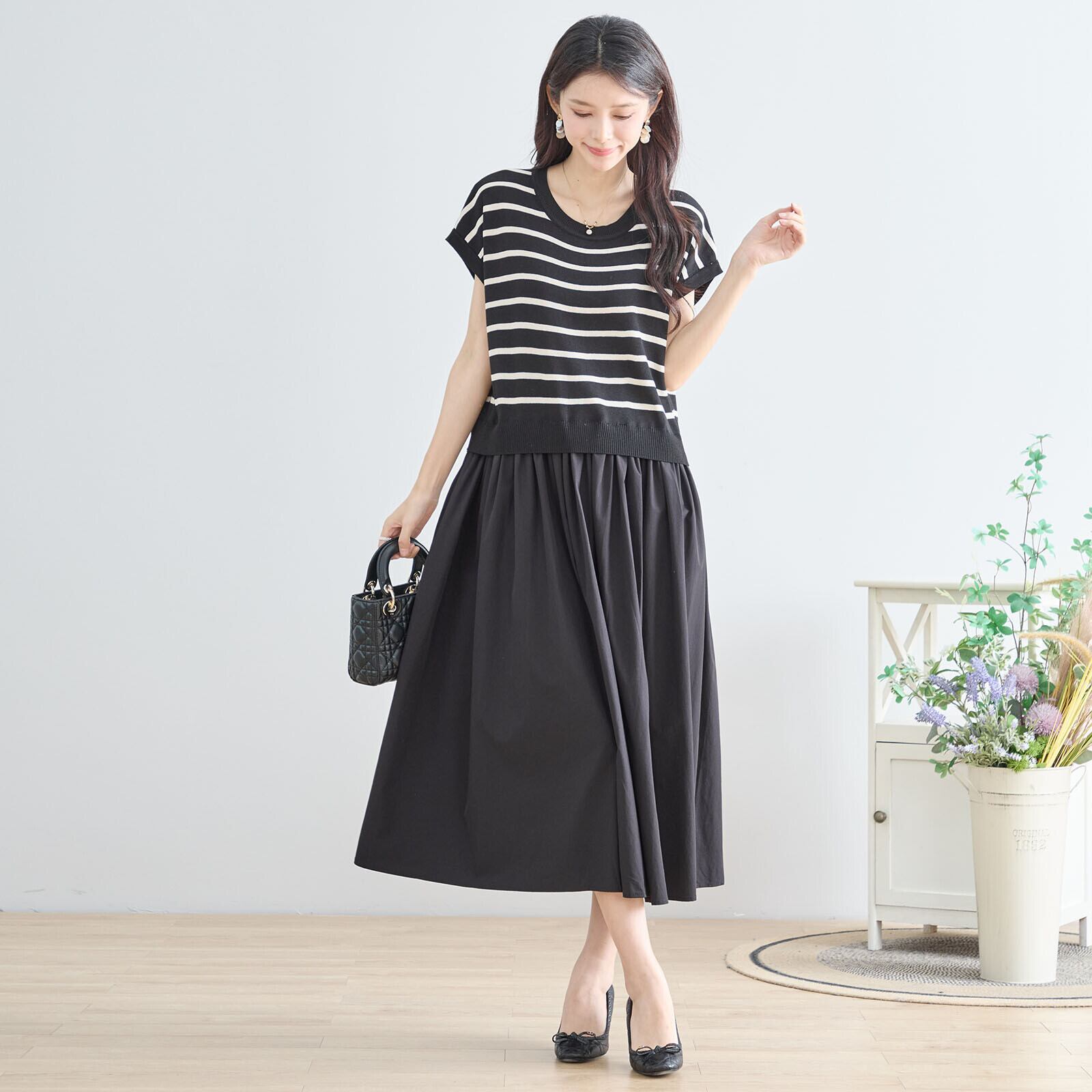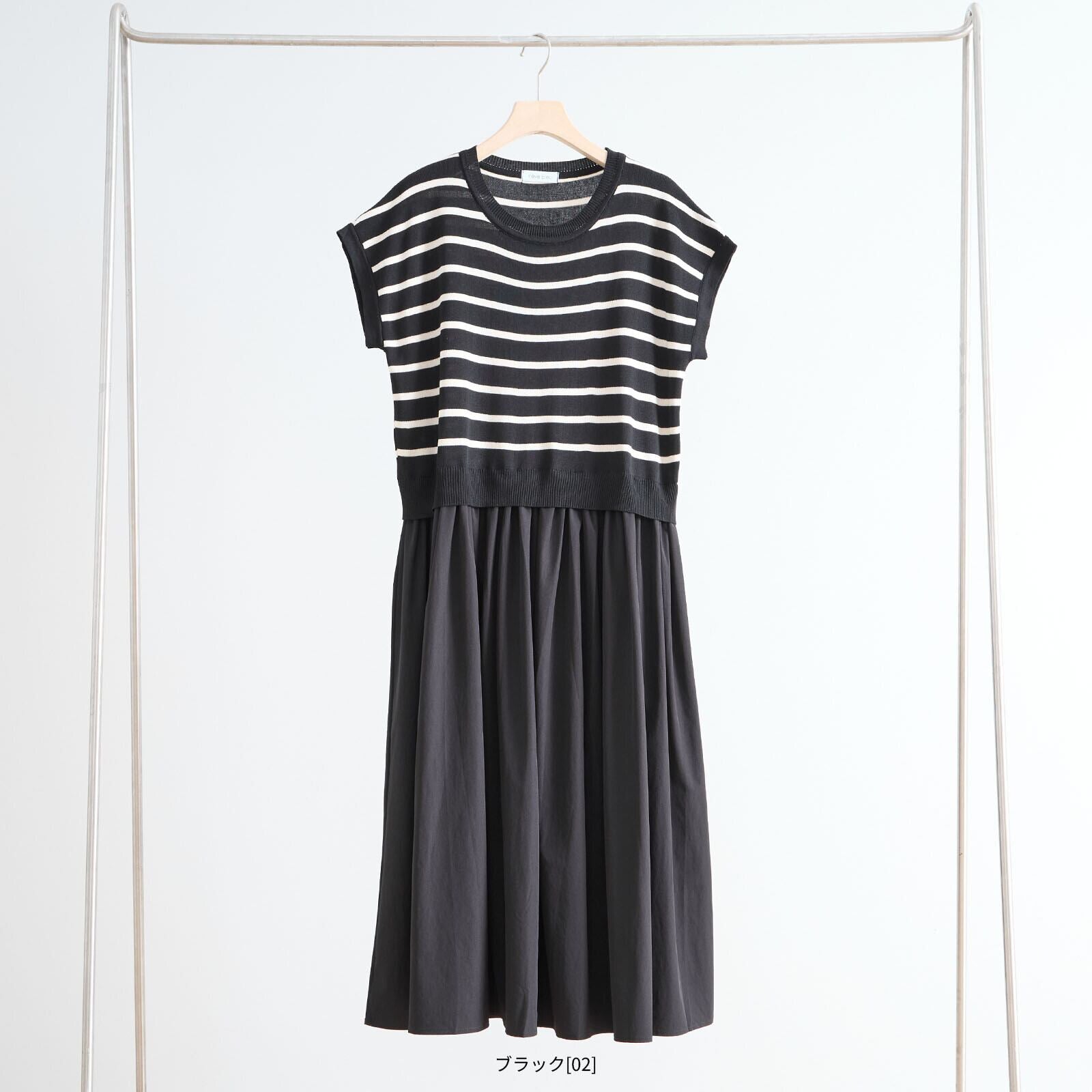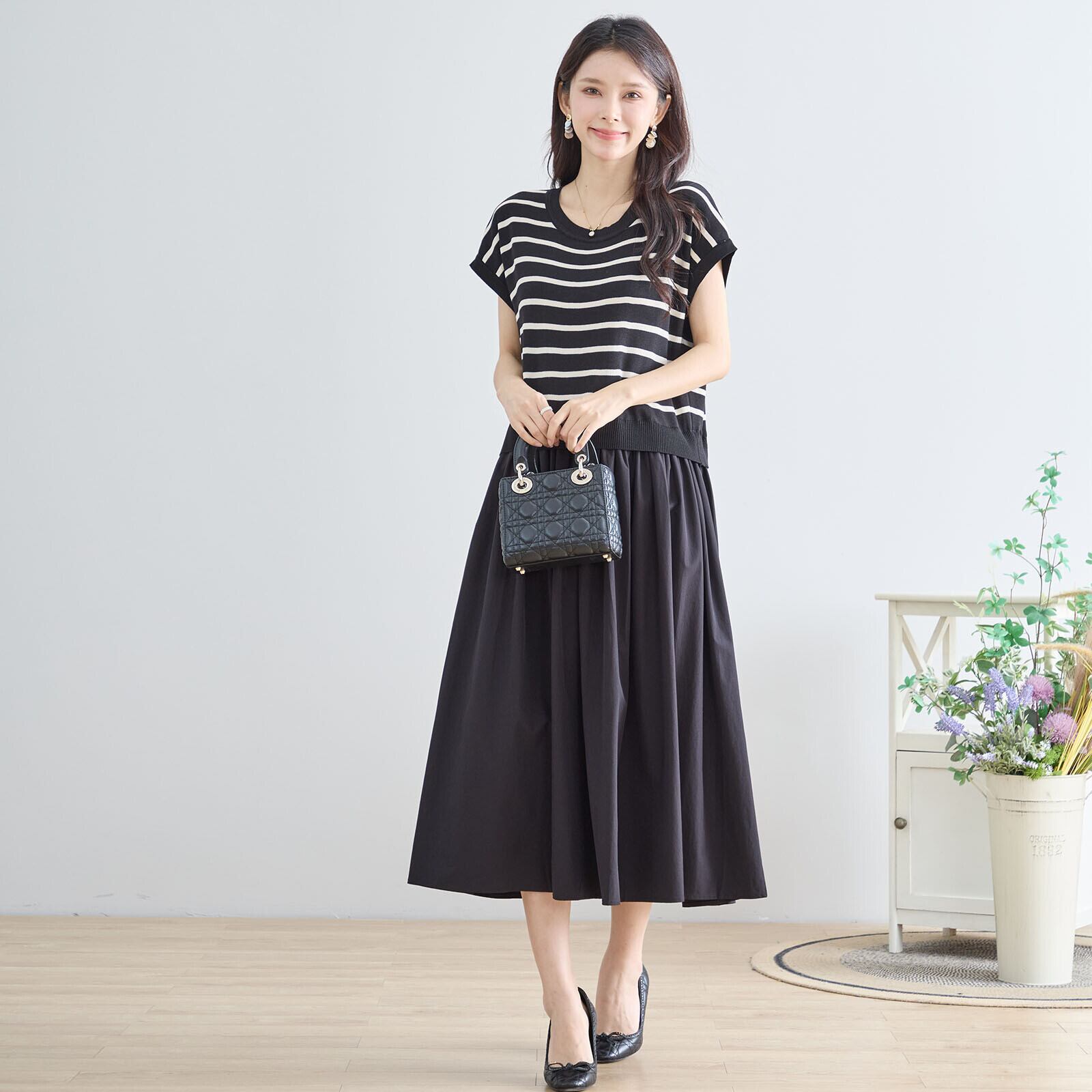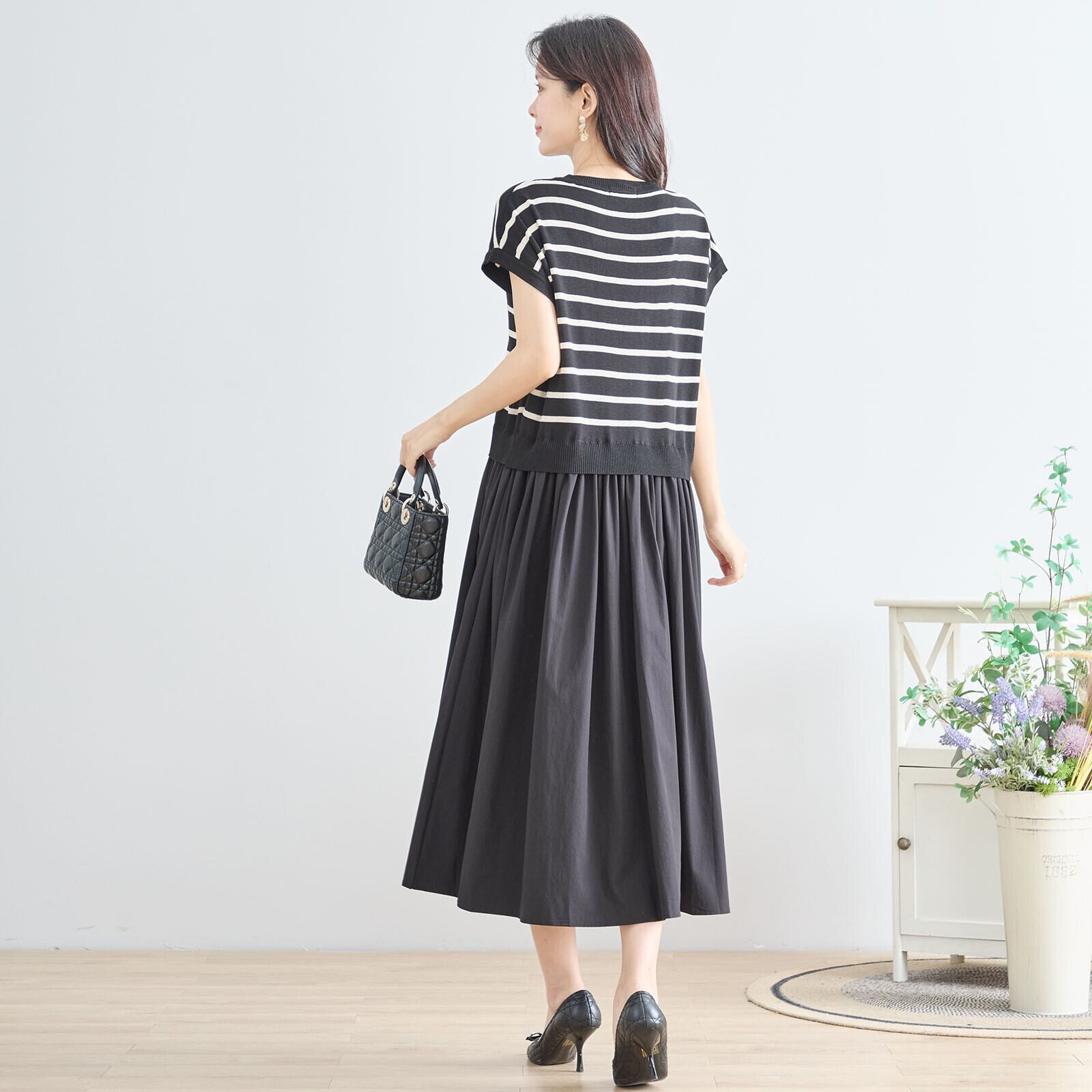 上半身はボーダーニット、スカート部分はふんわりギャザーで仕立てた異素材MIXワンピースです。